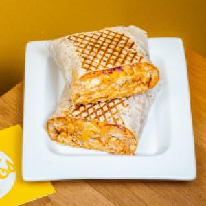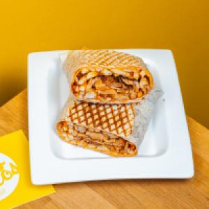 Poulet grillé, veggie épeautre et fromage provolone, cheddar, oignons rouges, frites, sauce barbecue et algérienne