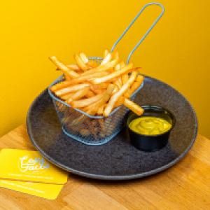 Poulet grillé, fromage de chèvre, méli-mélo de crudités, tomates, frites et sauce miel moutarde