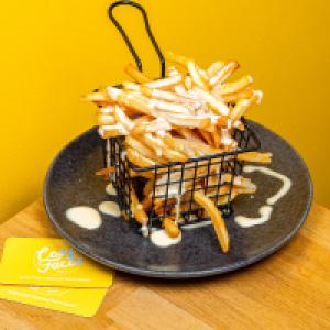 Sauce barbecue, poulet d'odko, oignons frits, frites & sauce fromagère maison