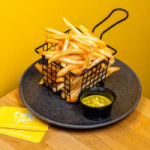 Poulet grillé, fromage de chèvre, méli-mélo de crudités, tomates, frites et sauce miel moutarde