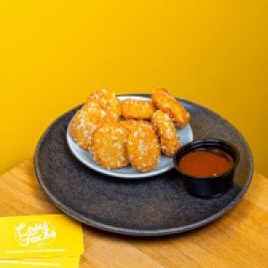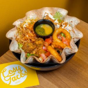 Falafels, oignons rings, maïs, légumes grillés, sauce andalouse, servi avec les frites à part