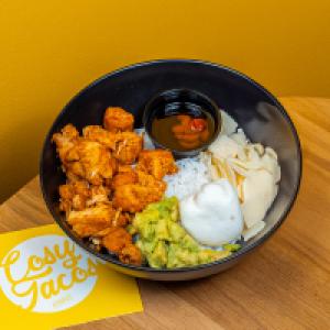 Riz, poulet x2, oeuf poché, avocat, grana padano, huile d'olive, pointe de sauce harissa