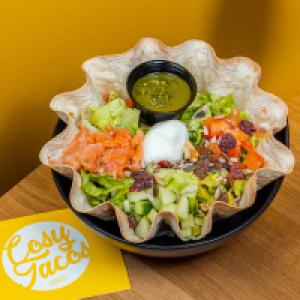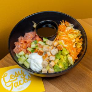 Salade, saumon fumé, avocat, œuf poché, mix de graines, tomates, concombres, sauce pesto