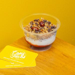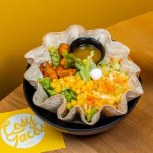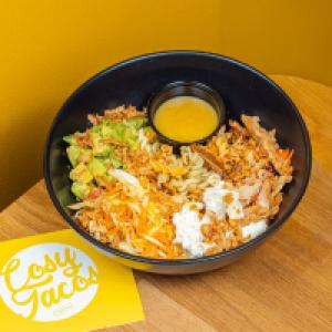 Poulet grillé, falafels, tomates, maîs, méli-mélo de crudités, salade, fromage blanc et sauce brésil